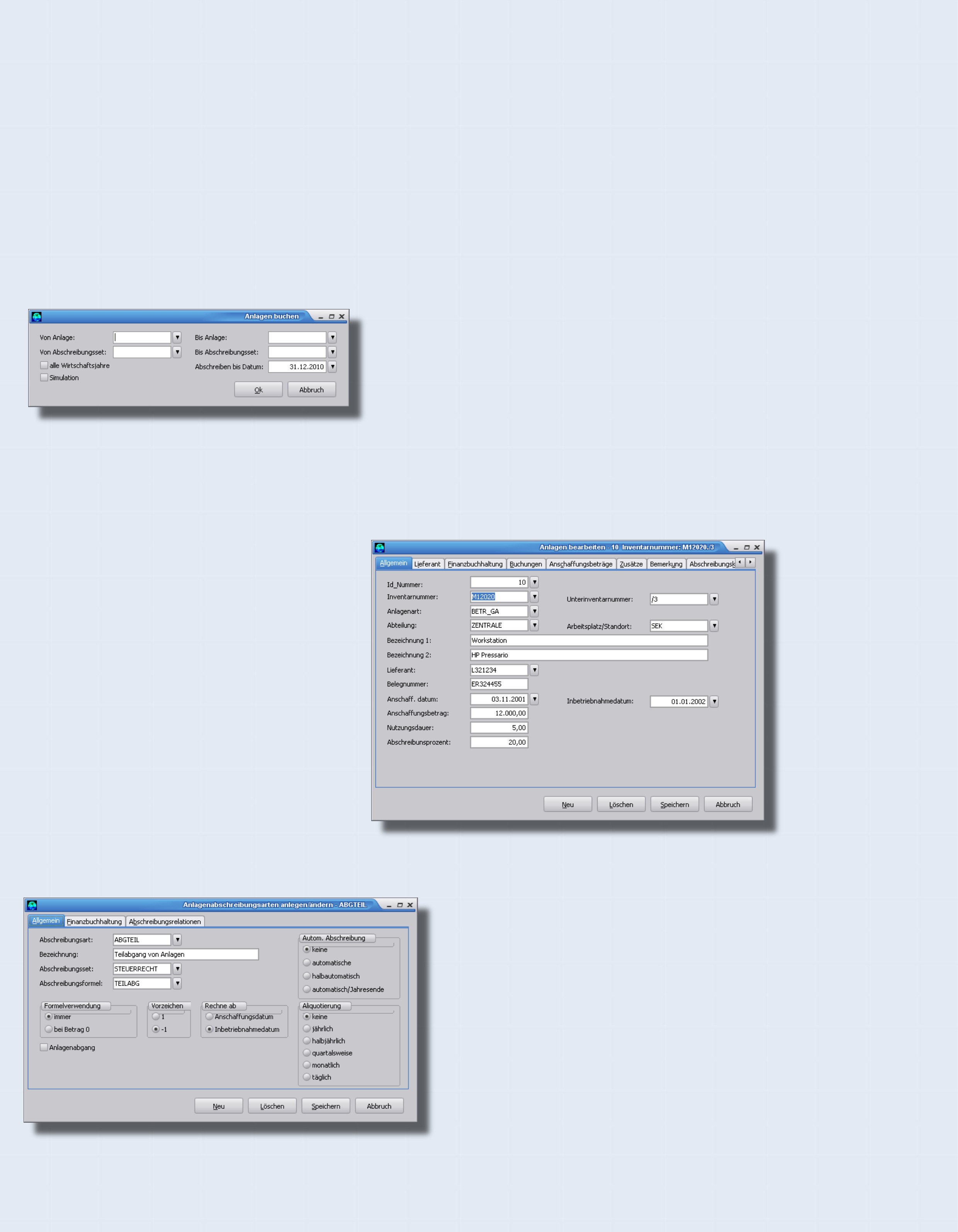 manuelles Buchen von Anlagen und Abschreibungen. Die Dialogform ermöglicht die Darstellung einer