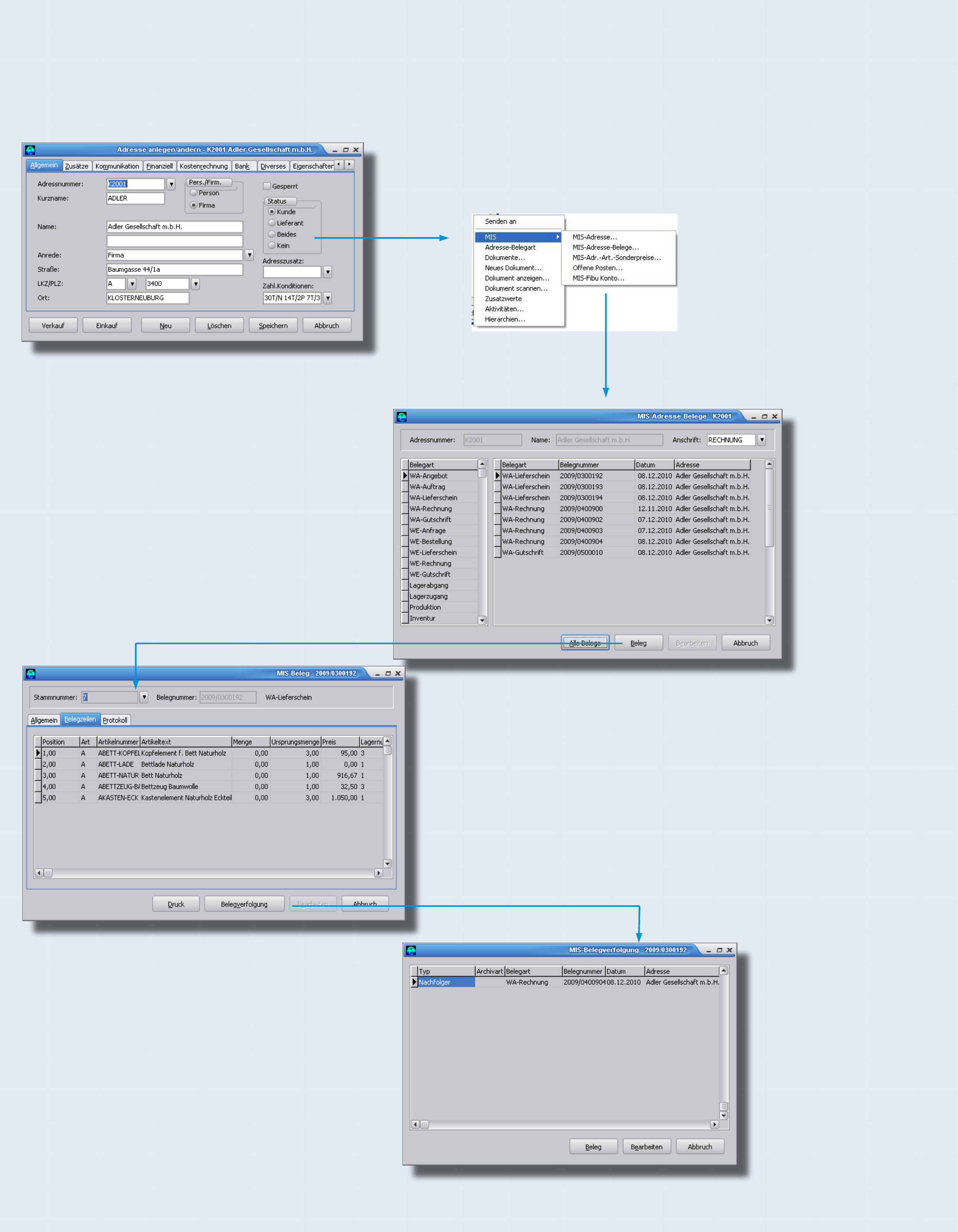 MIS-Adresse/Belege. Dieser Dialog zeigt die